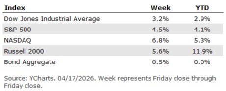 Outlook The market has recently been defined by a "wait-and-see" approach as investors weigh resilient corporate earnings against a volatile geopolitical backdrop. In the meantime, corporate America is off to a good start. With 10% of companies reporting 1st quarter earnings so far, the S&P 500 is currently on track for its sixth consecutive quarter of double-digit earnings growth.1 Looking at the bond market, the Treasury market can be characterized as having a resurgent upward-sloping curve amid macro stress. As of April 21, the 2-year sits at 3.81%, the 10-year at 4.32%, and the 30-year at 4.92% - providing a +51 bps spread between the 10-year and 2-year. This positive slope—normally a sign of growth—is currently being driven by what the IMF calls "fiscal dominance." Deficit-financed military spending and persistent energy-driven inflation are pushing long-term yields higher, even as the Fed remains sidelined with arguably little room to cut rates in 2026. . . . U.S. equity markets posted a solid week of gains as investor sentiment improved and market attention shifted back toward fundamentals. Easing oil prices, reduced geopolitical anxiety, and encouraging early-season earnings results helped push major indexes back toward recent highs. The Nasdaq Composite extended its advance for a second consecutive week, underscoring renewed leadership from technology and growth stocks. The S&P 500 also moved higher, supported by broad participation across sectors, while the Dow Jones Industrial Average recorded more modest gains. After a period of heightened volatility earlier this spring, markets appeared more comfortable re-engaging with risk as several near-term headwinds softened. Oil Prices Ease, Geopolitical Fears Diminish One of the most important influences on the market last week was a moderation in crude oil prices. Energy prices had risen sharply in prior weeks amid geopolitical uncertainty, contributing to inflation concerns and market unease. During the week, fears of prolonged supply disruptions eased, allowing oil prices to retreat from recent highs. Lower energy prices tend to ripple positively through the economy by helping consumers, lowering transportation costs for businesses, and reducing inflationary pressure. While geopolitical risks have not disappeared entirely, markets appeared increasingly confident that near-term developments are manageable. Investors have refocused on economic and earnings fundamentals rather than headline risk. Economic Data: Mixed but Stable Fundamentals Incoming economic data during the week was mixed, though largely consistent with an economy that continues to grow at a moderate pace. Consumer sentiment declined notably, reflecting lingering concerns around higher prices and tighter household budgets. Inflation expectations rose in response to earlier energy price increases, and consumers expressed greater caution about personal finances. Markets largely viewed the sentiment data as backward-looking, capturing anxiety from earlier volatility rather than the recent easing in oil prices. Importantly, broader economic fundamentals remain intact. Employment conditions are stable, household balance sheets remain relatively healthy, and consumer spending has continued to show resilience. Investors appeared willing to look past weaker sentiment readings in favor of indicators tied more directly to actual economic activity. Inflation and Federal Reserve Expectations Inflation remained a focal point, but concerns softened as energy prices stabilized. Recent inflation readings had been driven primarily by higher gasoline and transportation costs, and the pullback in oil prices helped reduce fears that inflation would accelerate further. Federal Reserve officials reiterated a patient, data-dependent approach, emphasizing the importance of allowing time for policy to work through the economy. Market expectations continue to favor steady interest rates in the near term, with any future adjustments dependent on how inflation and growth evolve. This stability around monetary policy contributed to improved market confidence during the week. Earnings Season Begins on a Constructive Note The first quarter earnings season began with encouraging signals, particularly from large financial institutions. Early reports showed continued profitability, supported by steady loan growth, healthy capital levels, and strong trading activity. Technology companies also remained in focus. Continued spending on artificial intelligence, automation, and productivity tools reinforced optimism about longer-term growth opportunities. While some companies acknowledged ongoing cost pressures, overall earnings expectations for 2026 remained resilient, helping support equity valuations. Markets Refocus on Fundamentals All in all, with oil prices easing, geopolitical concerns less acute, and earnings season underway, markets demonstrated a renewed ability to focus on fundamentals rather than short-term uncertainty. The combination of improving market performance, a two-week winning streak for the Nasdaq, and steady policy expectations helped reinforce confidence.