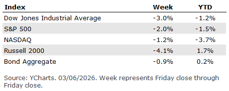 Outlook We suspect inflation may rise from current levels, causing the Federal Reserve to maintain the Fed Fund policy rates for now - with a chance of rate hikes over the next few months. Our suspicion that the rate of consumer price increases could rise is based on a combination of factors, including the dreaded tariff-related price hikes, rising global energy prices related to the War with Iran, the AI datacenter boom, and fiscal spending. While the next official Consumer Price Index (CPI) report will be out on Friday, real-time forecasting from the Cleveland Federal Reserve Bank shows a slight pickup in current levels.1 However, the trend since 2022 has been that of declining inflation, so a reversal to rising inflation is still far from certain.2 Nevertheless, should our suspicion prove correct, many of these fundamental factors (tariffs, geopolitics & energy, fiscal spending) appear to be longer-term in nature - putting upward pressure on long-term inflation expectations and in-turn possibly long-term interest rates. In this scenario, an opportunity may arise by allowing long-term conservative investors to allocate assets to higher long-term bond yields. The good news is that investors can take a wait-and-see approach, allowing yields to rise first before adjusting their portfolios. . . . U.S. financial markets navigated a volatile week as geopolitical escalation, surging oil prices, and a weaker-than-expected labor report shaped investor sentiment. Despite the heightened uncertainty, underlying corporate fundamentals, reflected through a strong earnings season, offered a degree of stability amid the volatility. Geopolitical Tensions: Iran Conflict Drives Market Volatility The global risk backdrop was dominated by escalating military conflict involving the U.S., Israel, and Iran. Following coordinated U.S.-Israeli strikes that killed Iran’s Supreme Leader Ayatollah Ali Khamenei, Iran retaliated with attacks across the region, prompting concerns over a broader and prolonged confrontation. As conflict deepened, concerns rose around a potential closure of the Strait of Hormuz, a vital shipping conduit for roughly 20% of global crude. Tankers are already reported stalled near the strait due to heightened risk, amplifying fears of broad supply shortages. The conflict also directly disrupted about one-fifth of global crude and natural gas supply, as infrastructure across the region came under attack. This has implications for global supply chains, particularly for developing economies heavily reliant on maritime trade. Oil Prices Surge on Supply Disruptions Oil markets experienced significant turbulence, driven by both actual supply disruptions and fears of future constraints. Early in the week, traders reacted to attacks on vessels near the Strait of Hormuz and anticipated disruptions to Middle Eastern exports. WTI opened the week around $72–$73, while Brent climbed to about $79–$80 on Monday’s open, reflecting the market’s immediate reaction to rising geopolitical danger. By Friday, WTI settled at $90.90 and Brent at $92.69, with WTI logging its largest weekly gain on record in futures data back to 1983. As the conflict intensified, both benchmarks briefly traded above $100 and even approached $119 intraday before pulling back when headlines suggested G7 nations might release emergency reserves. The surge in oil prices renewed concerns about inflation and pushed Treasury yields higher, contributing to a broader pullback in equity markets heading into the weekend. U.S. Labor Market: A Weaker-Than-Expected February Jobs Report Economic data added to the week’s uncertainty. The February U.S. labor market report, released Friday, came in weaker than expected:3 - Nonfarm payrolls fell by 92,000, surprising analysts who had anticipated an increase of 58,000.
